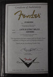 Other premium features include Vintage Modified #2 wiring with Tone-Saver bleed circuit (eliminates tone loss when volume is turned down), five-way pickup switch, three-ply mint green pickguard, Custom Shop vintage synchronized tremolo bridge, vintage-style tuners, wing string tree with tall metal spacer, deluxe hardshell case, strap and certificate of authenticity.