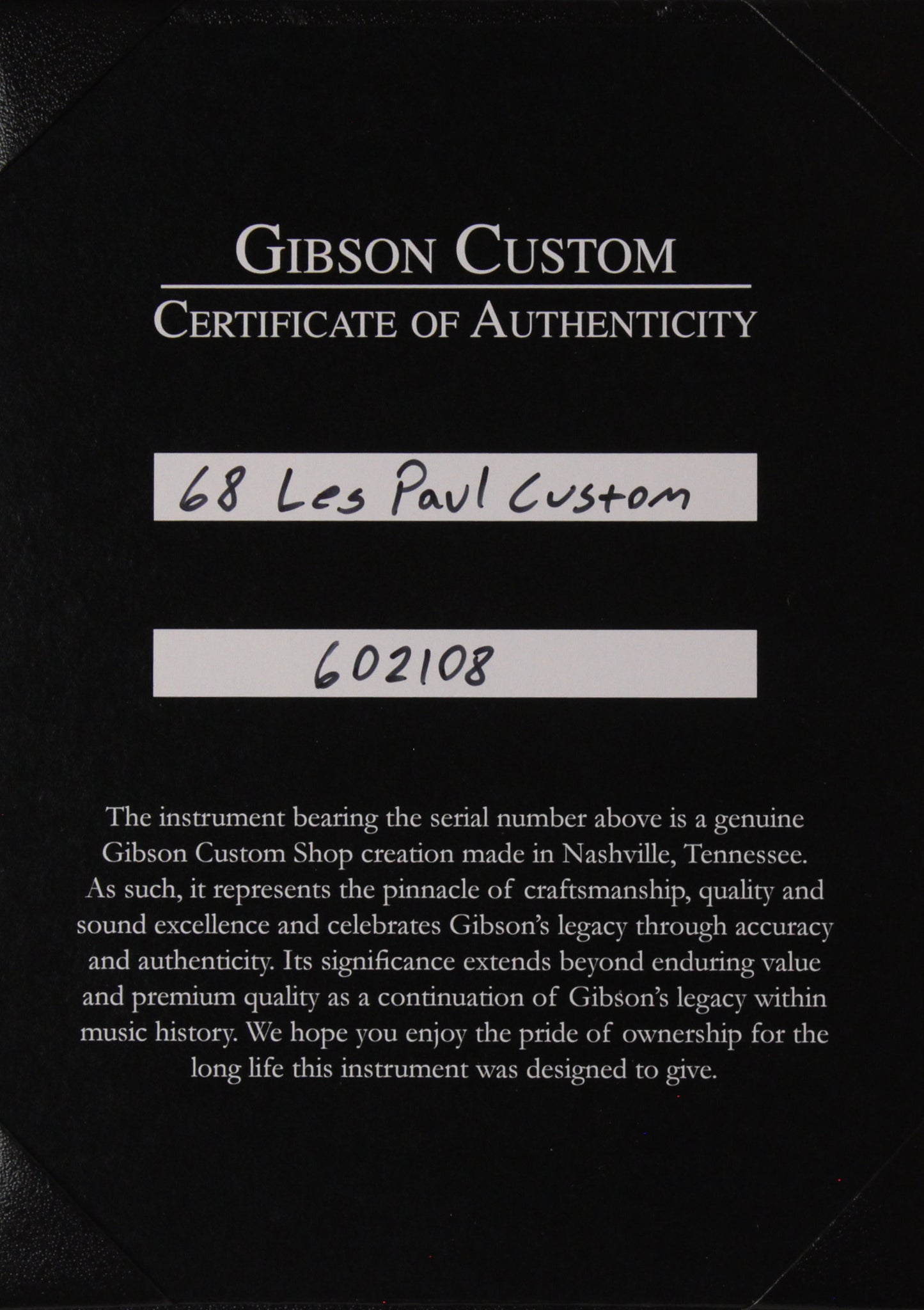 The 1968 Les Paul Custom marked a departure from its 1950s models with key enhancements. It featured a solid maple top over a mahogany back, delivering the clarity and attack favored by many rock players. The guitar came equipped with two humbuckers instead of three, allowing for greater picking space. Additionally, a 14-degree peghead angle reduced string tension. These innovations established the enduring standard for the Les Paul Custom line. This 1968 Les Paul Custom Reissue faithfully recreates every detail and specification, crafted by Gibson Custom Shop’s expert artisans to offer an authentic vintage playing experience.