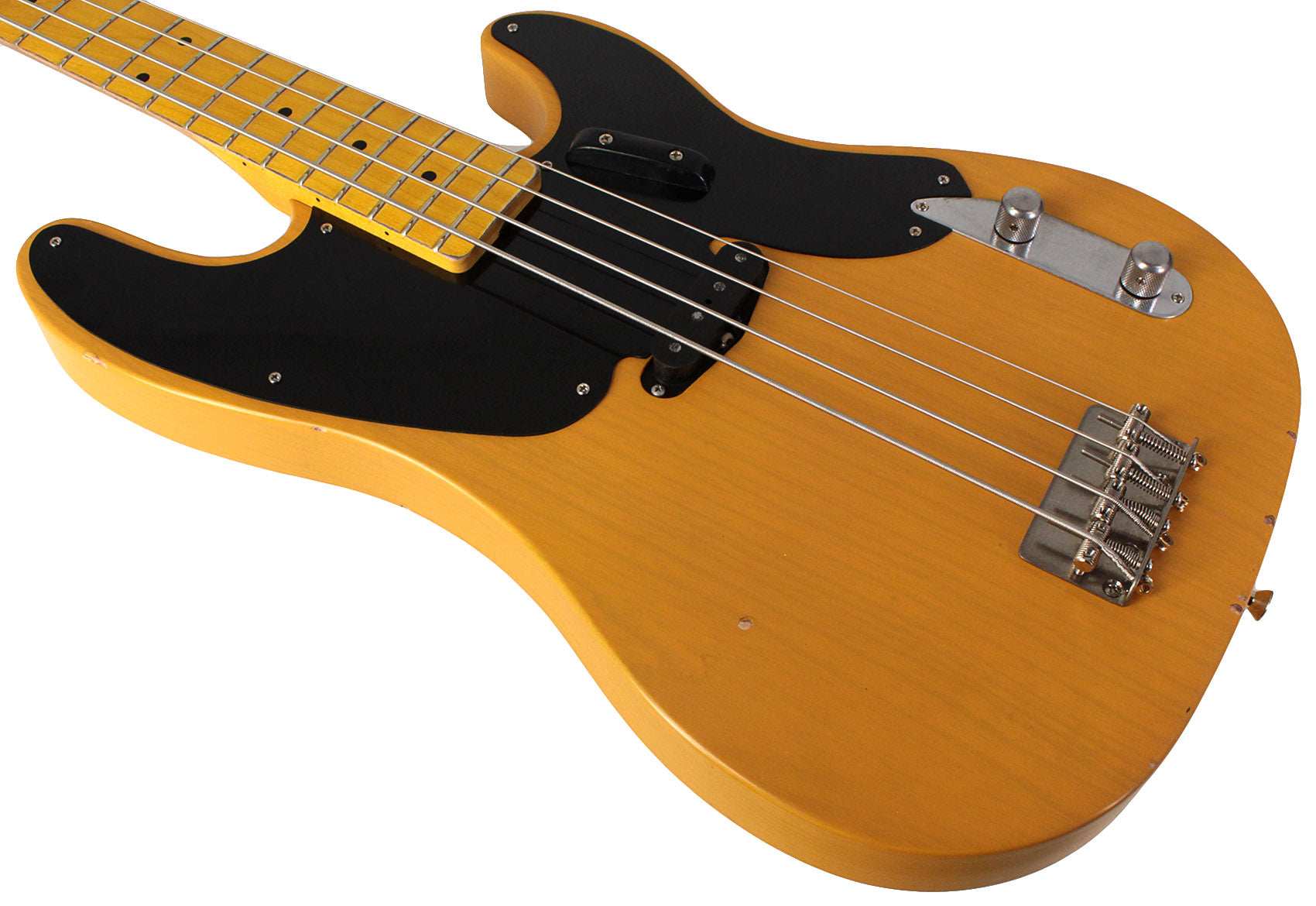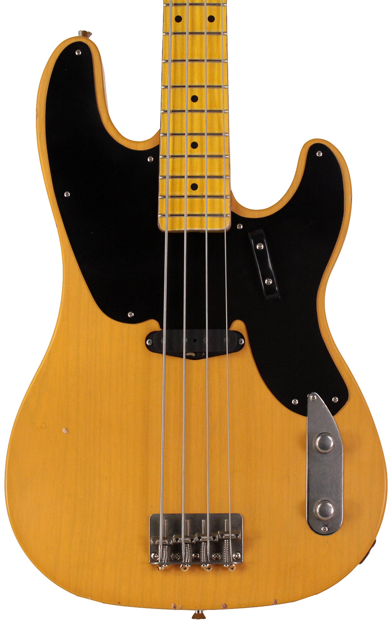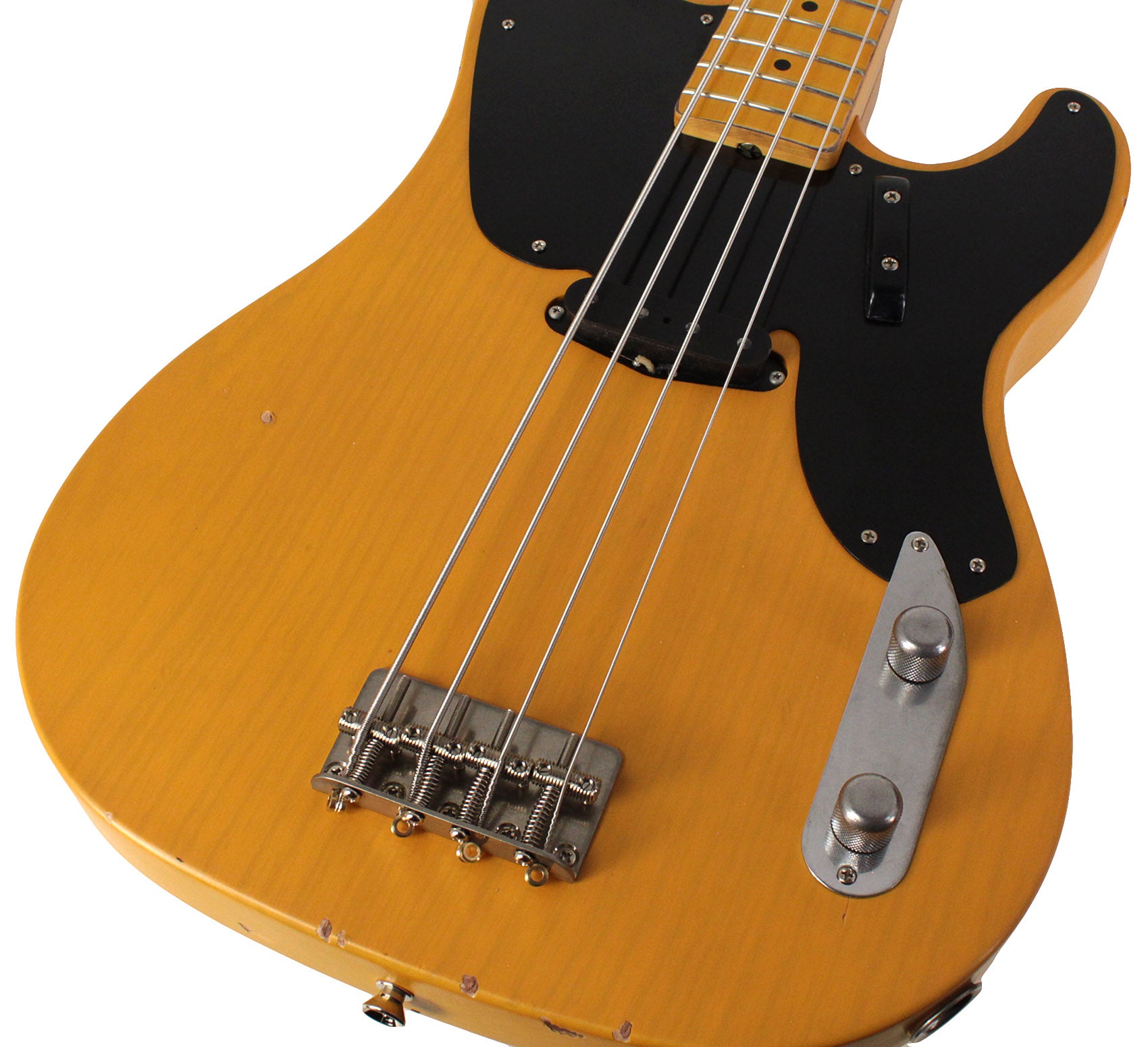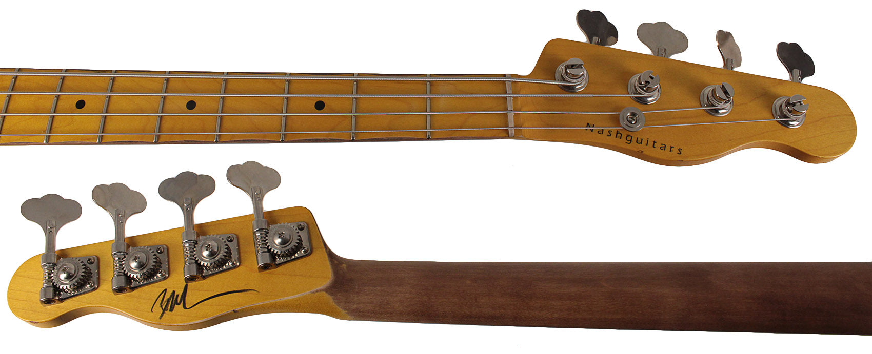 If anyone knows about building vintage guitars, it's Bill Nash! He has worked with a HUGE number of them for many years and has a great deal of knowledge about how a vintage guitar looks and feels. The aged control knobs, pickguards, dinged and scratched finish, and aged hardware make the bass look old, but the modern techniques used to make the guitar ensure that it plays like a brand new instrument. Each Nash PB-63 is built by hand, so each one is completely unique. It features a Maple Neck, an ash body, and a Jason Lollar hand-wound pickup. The bridge is a high quality aged traditional bridge with adjustable steel saddles made from top shelf materials, and the entire bass is given a level of wear and tear via an aging process.