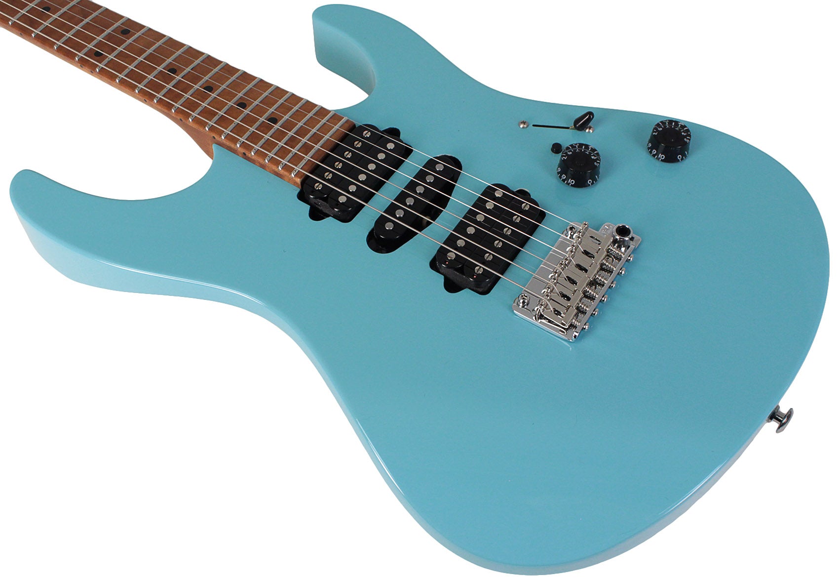 The Modern Antique utilizes a basswood body with a plain maple top, creating a well-balanced and clear tone. The neck and fingerboard are made of roasted flamed maple for increased stability and a visually stunning appearance. With a comfortable M.E. neck profile (.780-.830) and a compound 10"-14" radius, this guitar provides a seamless playing experience, perfect for both live performances and studio recordings.