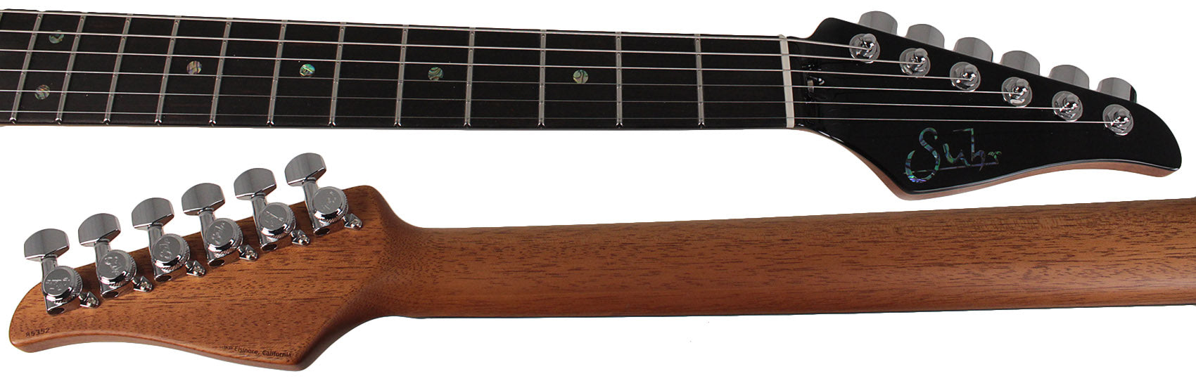For this run of our exclusive Modern T Select, we chose to replace the rosewood fingerboard with ebony with abalone dots. We also went with a black painted headstock face with an inlayed abalone Suhr logo!