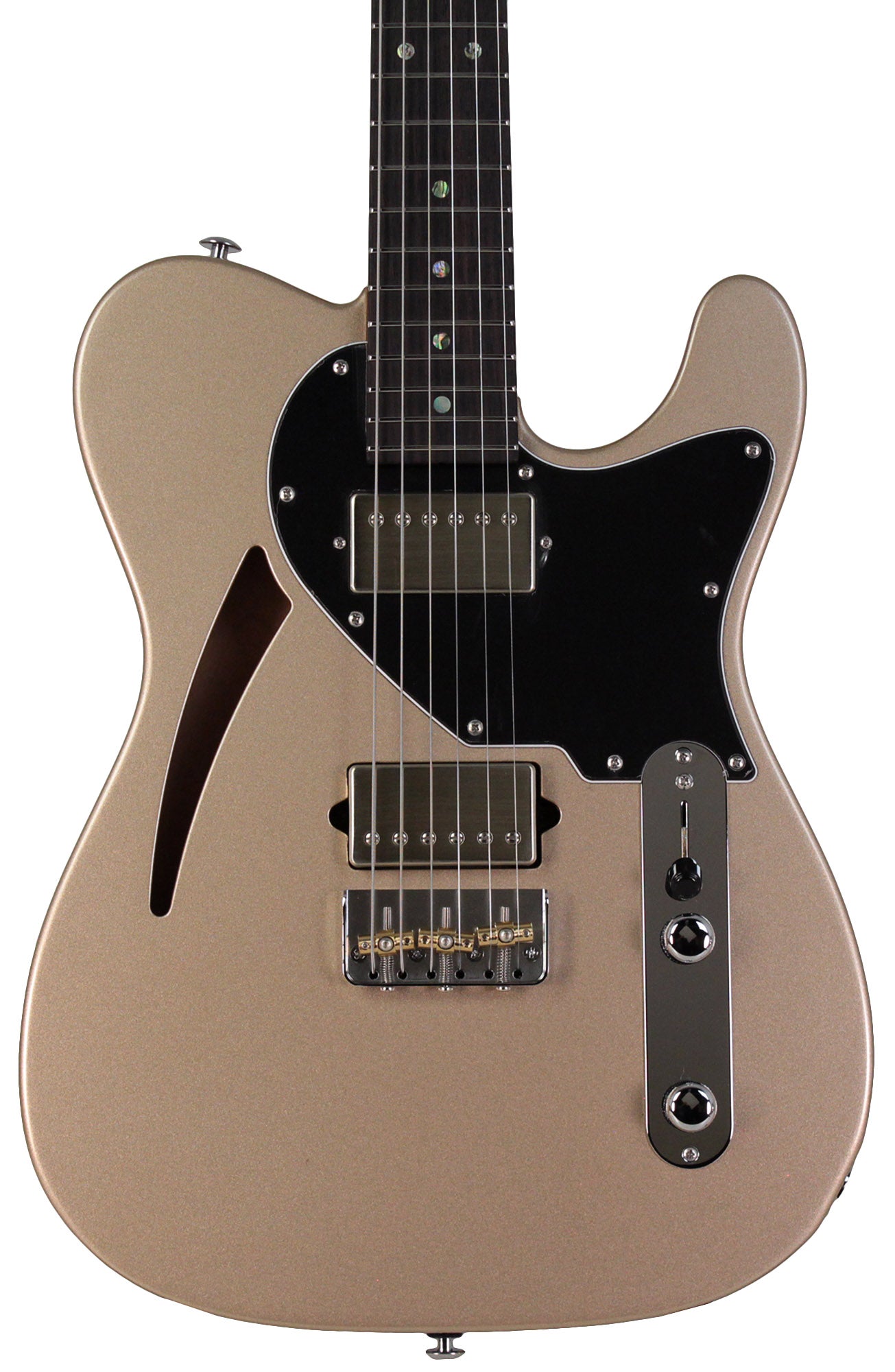 The Suhr Select Alt-T cat's Eye is essentially an Alt-T with some minor refinements. The maple neck is now upgraded to Roasted Maple, the fingerboard markers are Abalone, and the F-Hole has been replaced with the sleek Cat's Eye sound hole. We also chose some custom color/pickguard combinations.