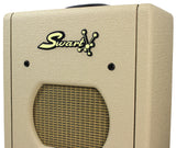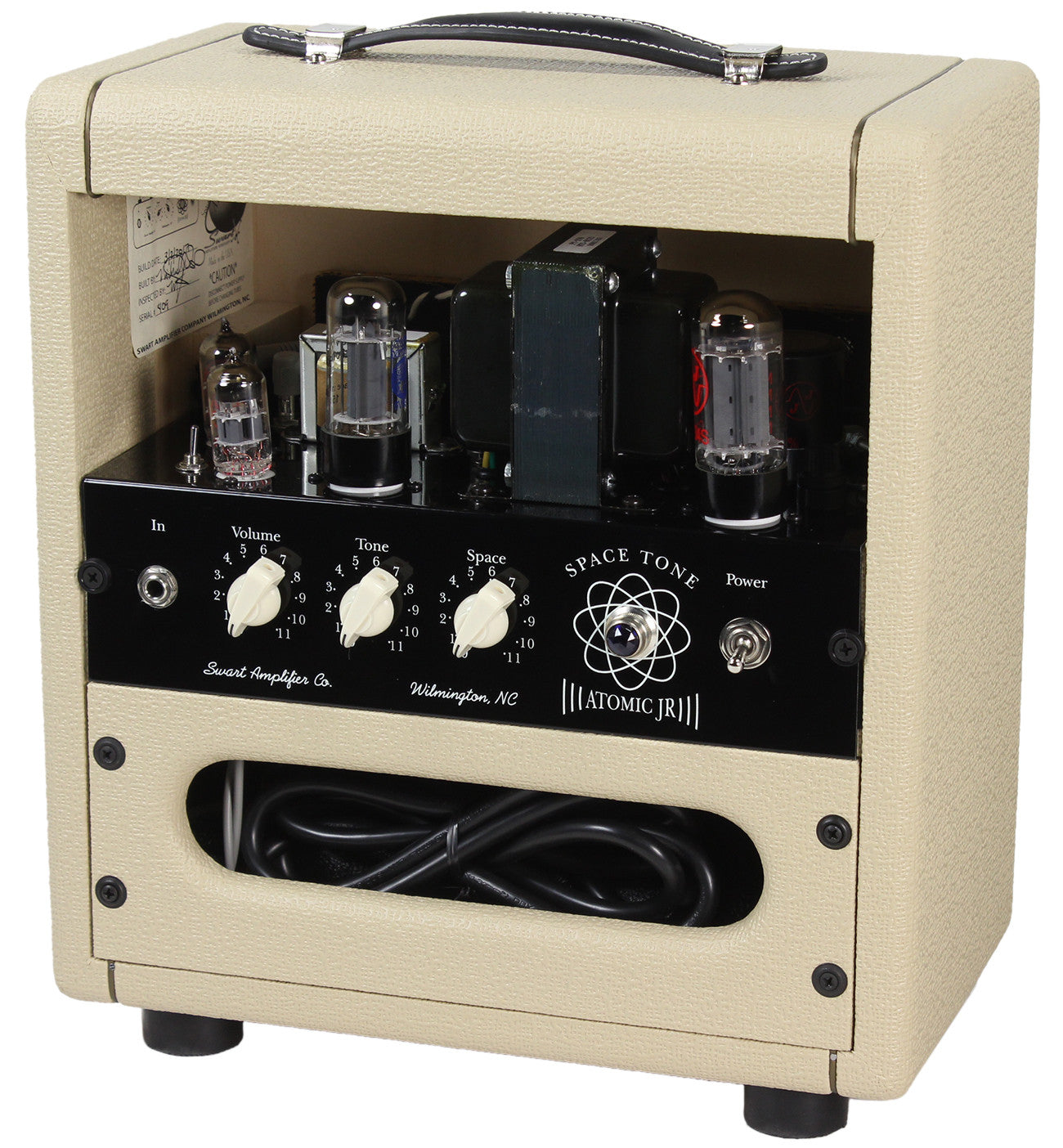 The Swart Atomic Jr is one of the newer creations from Michael Swart that builds on the ever popular Space Tone 6V6se line. Essentially, it's the 6V6se with reverb. But don't think for a second we are going to stop there with the description. The quality of this reverb mandates we speak a bit more of it. Swart didn't just copy some popular reverb circuit from another amp, he worked on this reverb for over a year. It's a triode based reverb stage utilizing a 12DW7 fed into a spring tank for astoundingly HUGE REVERB. While the tone of this little beast (and by little, we mean only 14 lbs) is quite serious, we find it at times humorous to play because of the amount of thick, lush, reverb that comes from this tiny box. It actually makes us chuckle (or LOL for you younger crowd). From the small stature it would be easy to assume a boxy tone with similar reverb, but take our word for it. You'd be wrong.One notable difference is a cool switchable gain option in place of the 6V6se feedback switch. When in circuit, the amp has more clean headroom and takes a bit longer to break-up. It's a slightly more controlled result. Flip it out of circuit and you have slightly less compression with a more raw take, quicker to get into the fun stuff.