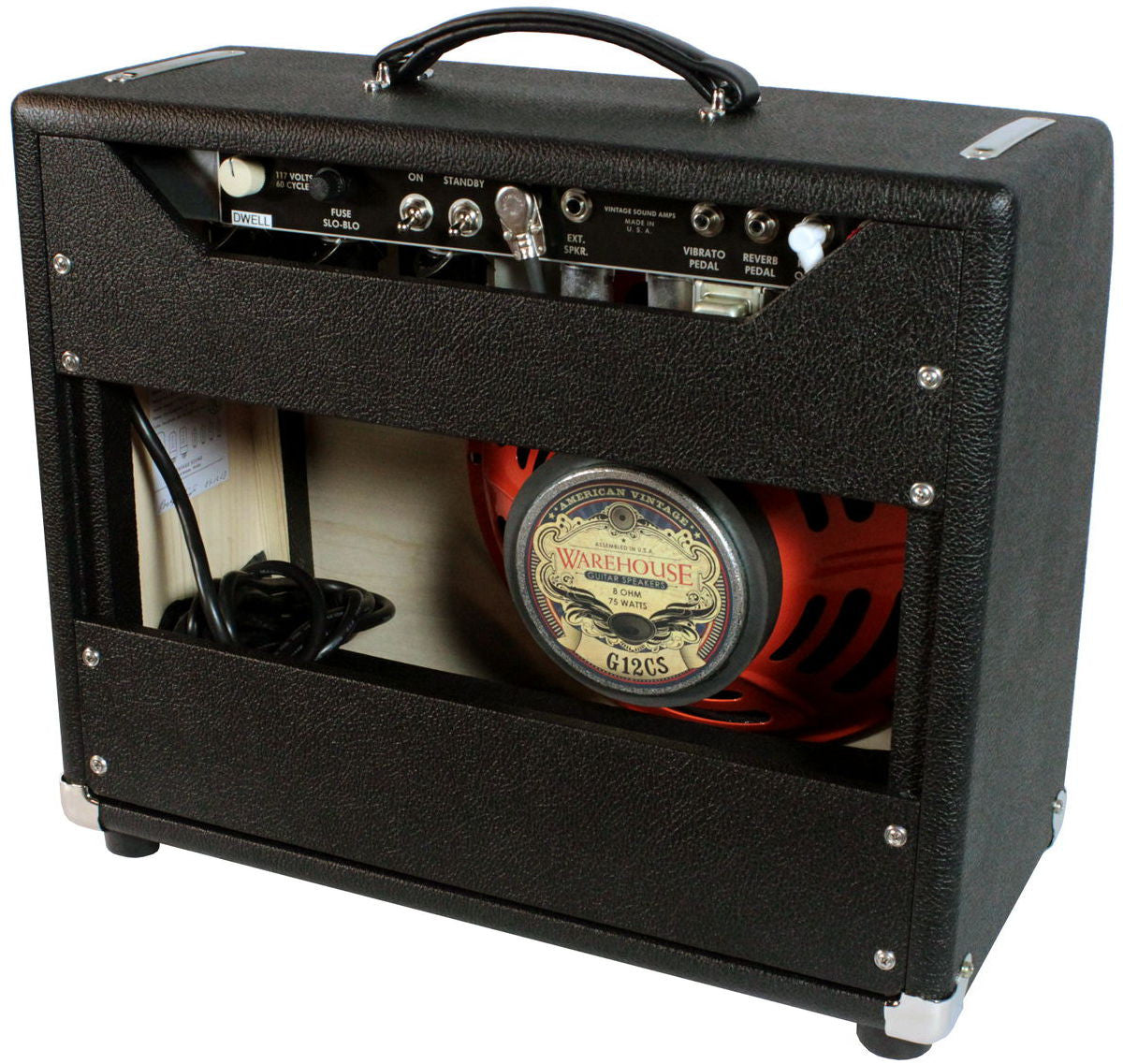 2) The reverb circuit is vastly upgraded. The stock reverb on a Princeton was a small 9" pan spring reverb. The Vintage 15 uses a large 17" spring reverb pan that's the same size as the one used in the Twin Reverb! The reverb circuit also includes a very nifty reverb dwell control on the rear of the chassis for varying the decay time.