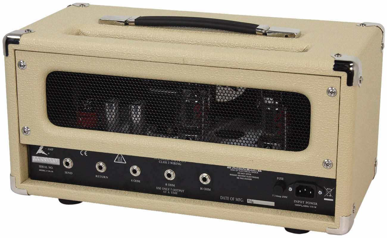 The Surgical Steel incorporates Dr. Z's unique EF86 front end. This pentode tube can accept inputs of various voltages, like those from volume pedals, and reproduce them with accurate symmetry without distorting the signal disproportionately as 12AX7 input tubes do. A full balance EQ section inputs a pair of ultra-linear connected KT88 power tubes. These powerful tubes (approximately 90 watts per pair) produce a rich, warm, and thick tone which is not possible with a solid state amp. This amp has 4, 8, and 16 Ohm speaker outs as well as a tube buffered (12DW7) effects loop.