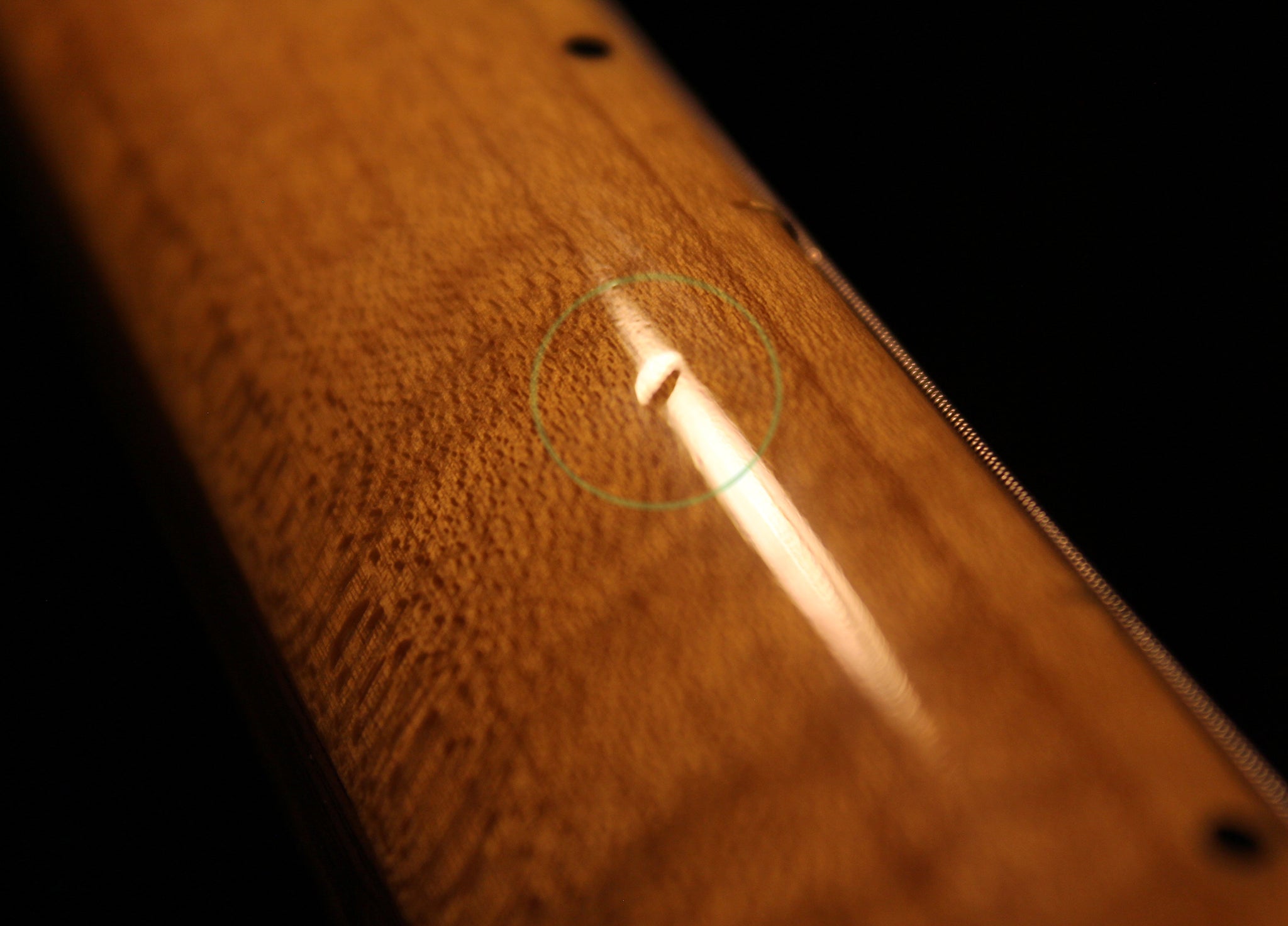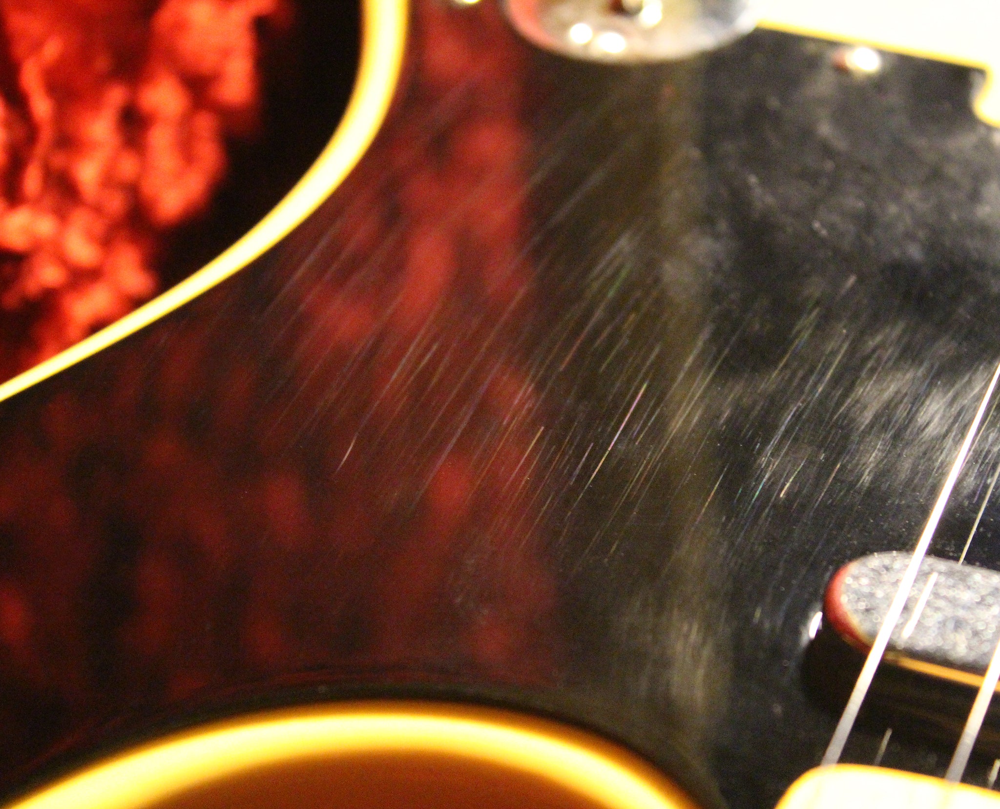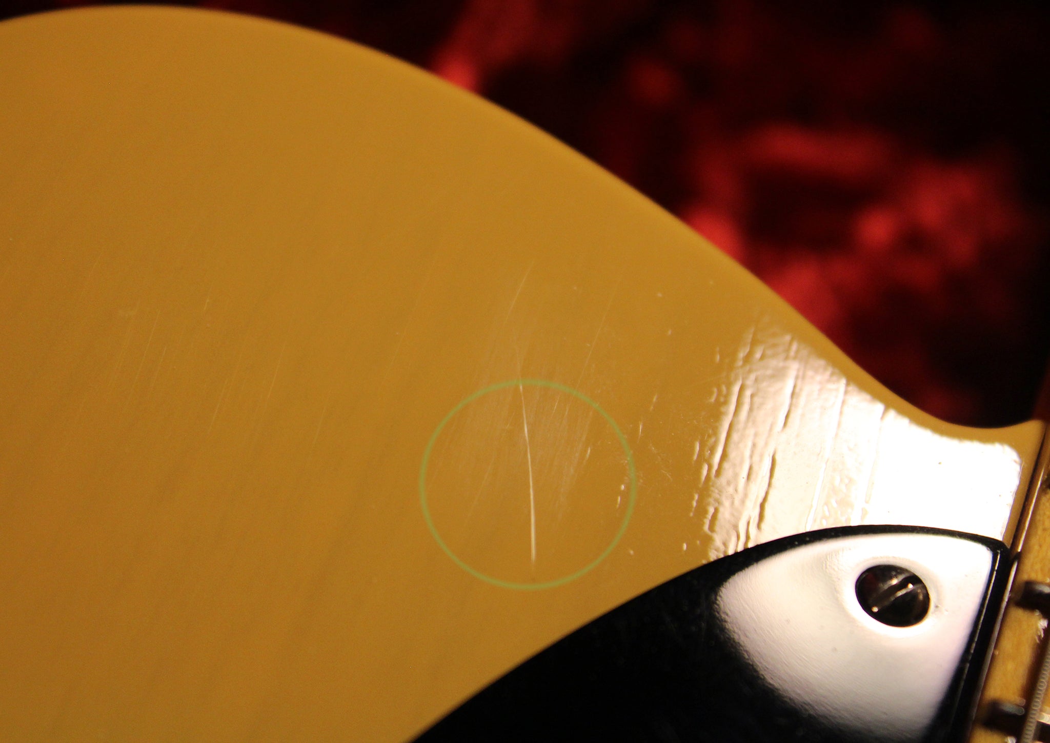 *This guitar has one very tiny ding between the third and fourth frets, a thin, light scratch and minor ware on the pickguard.* They're basically invisible and it took time to find a glare to show them :)