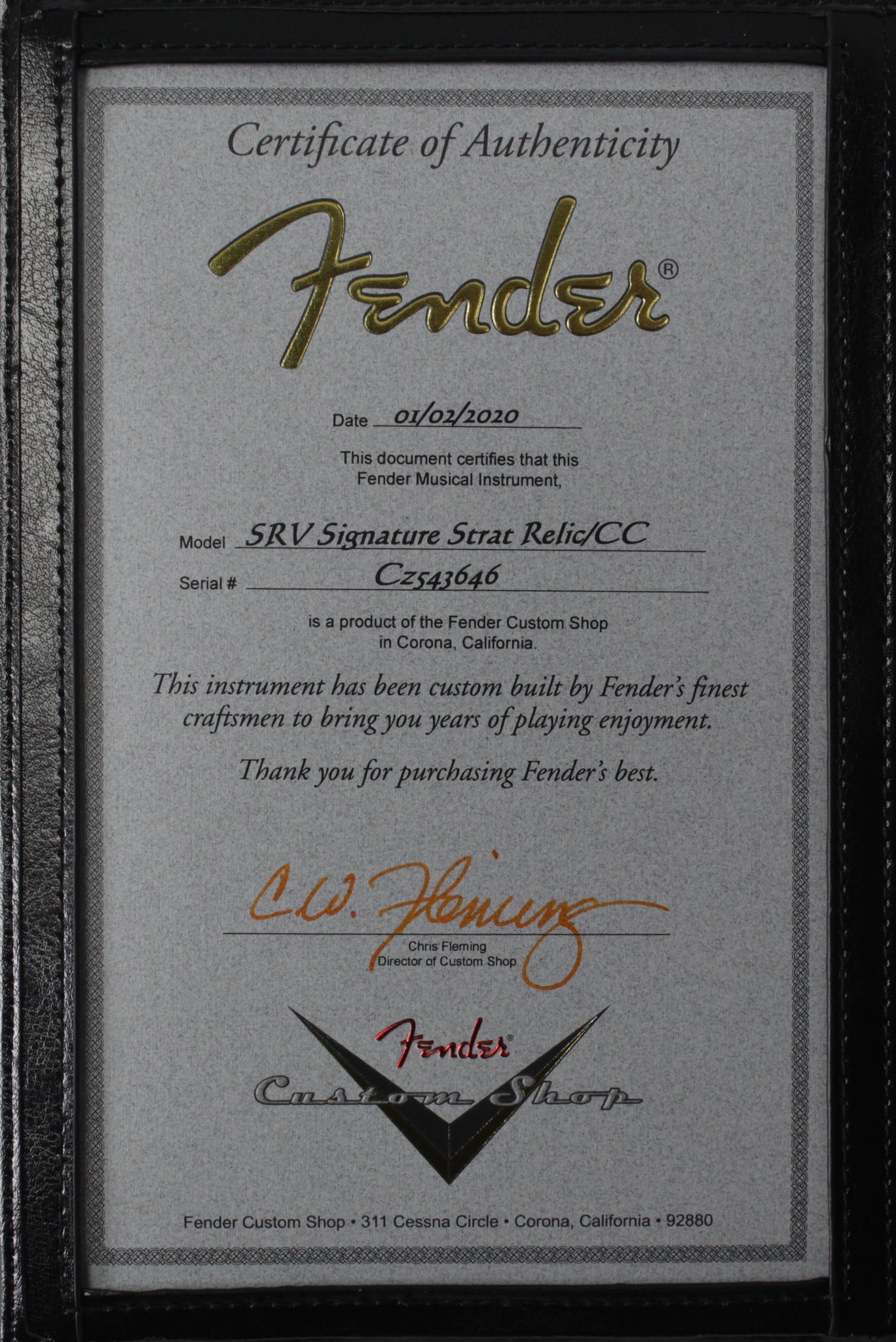 Other features include 5-way pickup switching, vintage-style wiring, 3-ply Black "SRV" pickguard, vintage-style tuning machines, rosewood fingerboard, bone nut and wing string tree. Includes deluxe hardshell case, strap and Certificate of Authenticity.