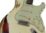 This Fender Custom Shop Special Run 61 Stratocaster Paint over Paint comes from a collaboration between the Fender Custom Shop and Humbucker Music, a Fender Showcase Dealer. We have always loved the look of the heavy relic'd paint over paint Strats, so we decided to do a highly custom run that includes Sherwood Green Metallic, Firemist Silver, Faded Ice Blue Metallic, Ocean Turquoise Metallic, Sonic Blue, Surf Green, Aged Olympic White, and Black, each over a Three Tone Sunburst finish. Also included are AAA Flamed Maple necks with AAA Rosewood fingerboards.