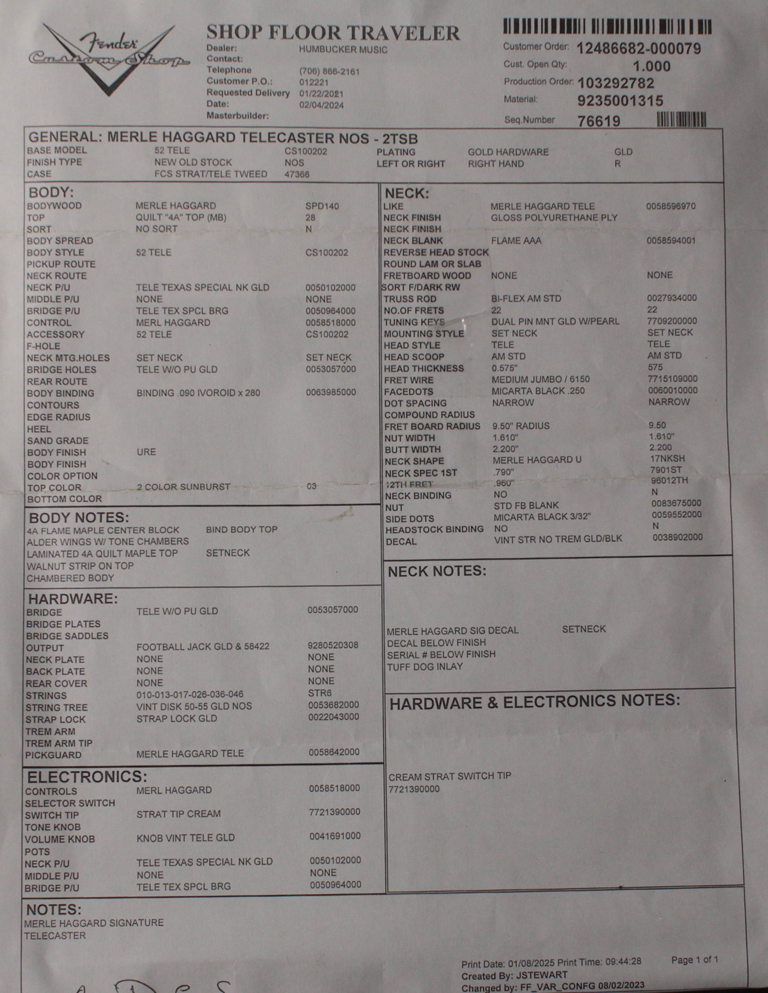Unique Features: Tone Chambers, Mother of Pearl "Tone Dog" Headstock Inlay, Ivoroid Body Binding, Set Neck, Deep Carved Heel, Merle Haggard Signature on Headstock