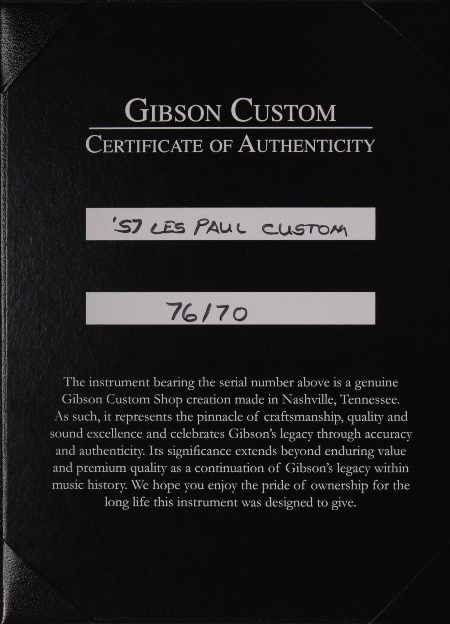 Renowned for its sleek design and striking Ebony, Pearl, and Gold finish, the 1957 Les Paul Custom stands as one of the most distinguished and visually stunning guitars ever crafted. Its body is uniquely carved from a single solid mahogany block, setting it apart from other Les Paul models. This construction delivers a rich mid-range tone that complements the bright resonance of the solid Ebony fingerboard. Representing the height of guitar artistry, tone, and design, the Gibson Custom Shop meticulously recreates every aspect of the original "Black Beauty," including exact dimensions, contours, inlay details, and the overall ownership experience.