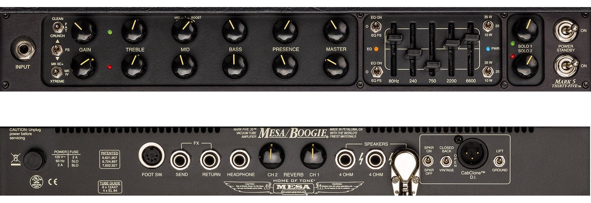 The Mesa Mark V 35 is available as both a head and a combo. It features everything that has made the Mark V 25 so successful over the last year while incorporating new and updated features like an all tube, long spring reverb tank, Independent SOLO control, more power options (10/25/35 watts per channel) and full set of cabinet voices built into to the on board CabClone.