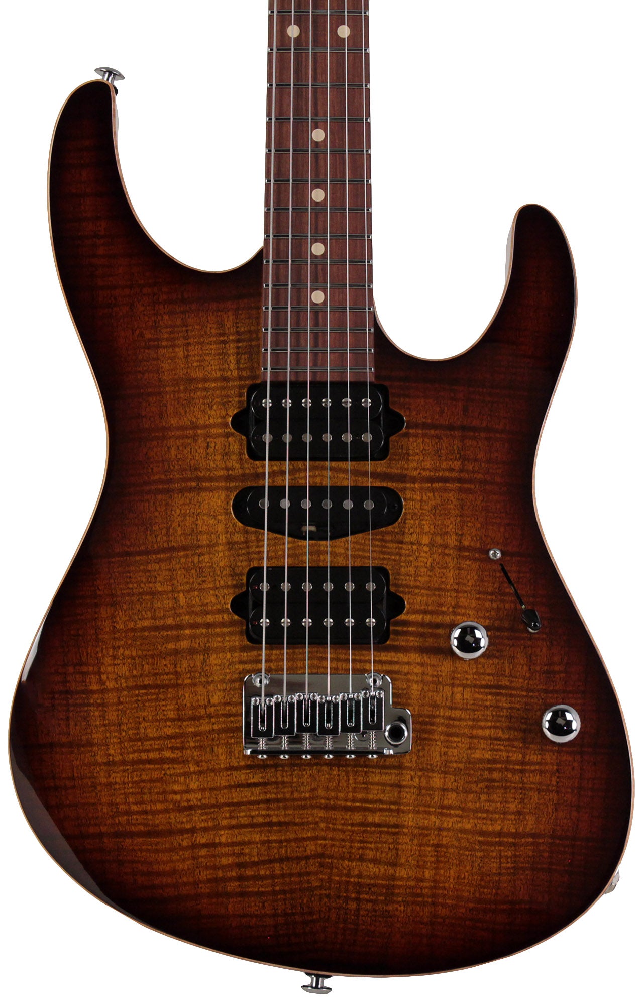 These guitars are light, toneful and perfectly balanced. Utilizing a Basswood body and Maple top, a fat, well-balanced tone can be achieved that produces smooth sounds without any harsh overtones. The finishing process provides an unparalleled combination of protection and beauty, while the thinnest possible coats of finish are applied to allow the wood to resonate freely and still provide ample protection. The neck is now constructed with roasted maple providing more stability and a darker aesthetic.
