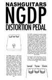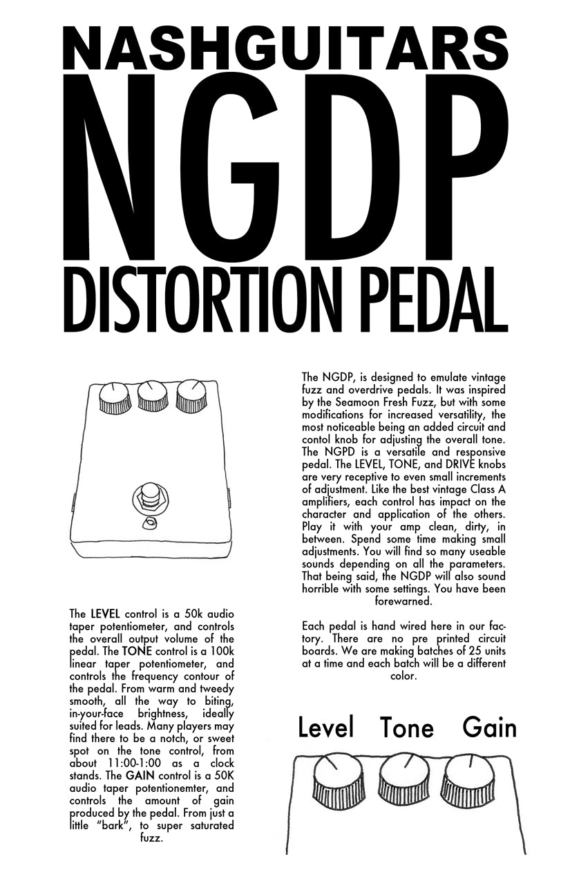 The NGDP is designed to be a vintage style Fuzz and Overdrive pedal. It was based on the Seamoon Fresh Fuzz, but with some modifications for increased versatility. Most notably an added tone control circuit.
