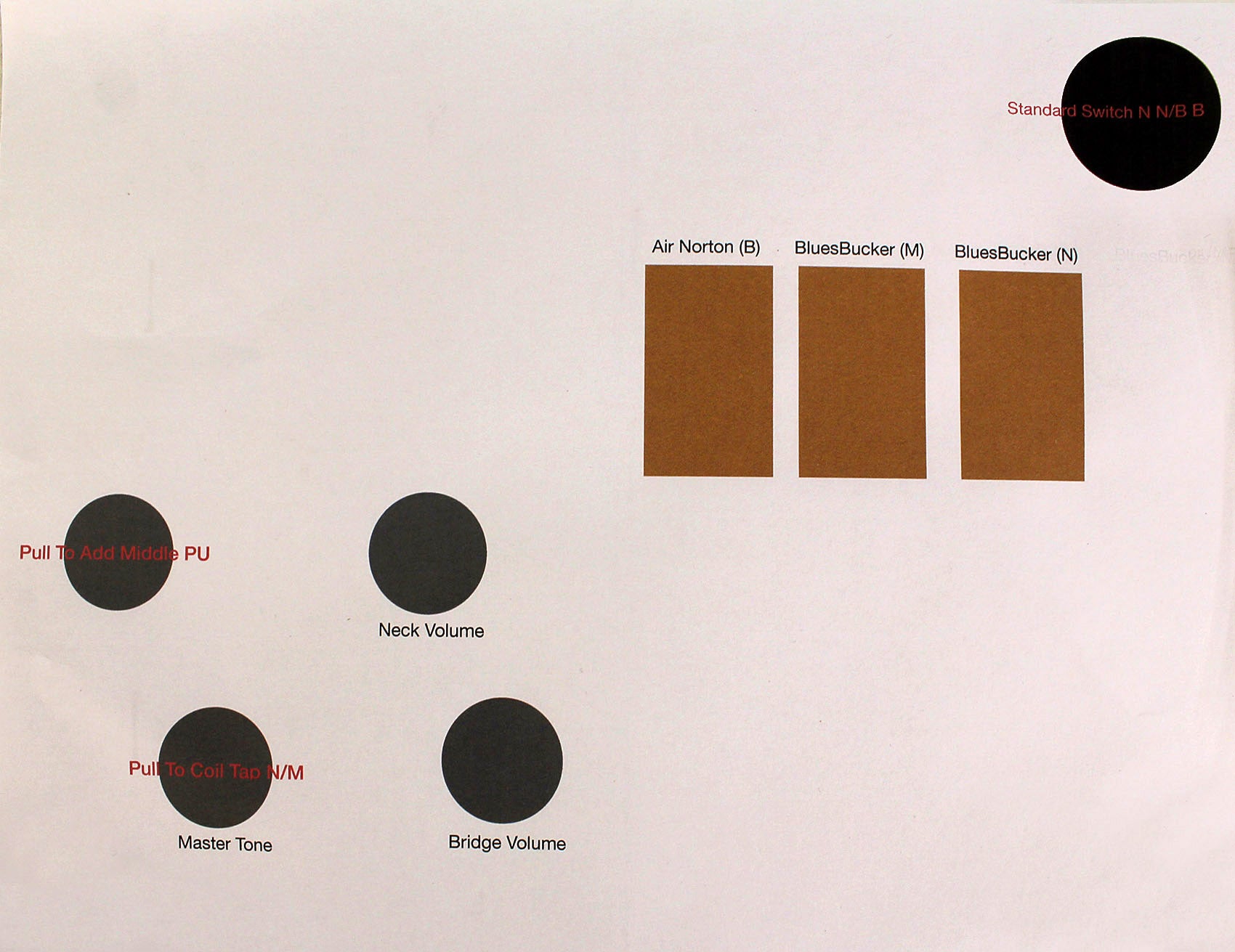 Controls: 2 volume, 2 tone with Coil Tap pots, 3-way pickup selector