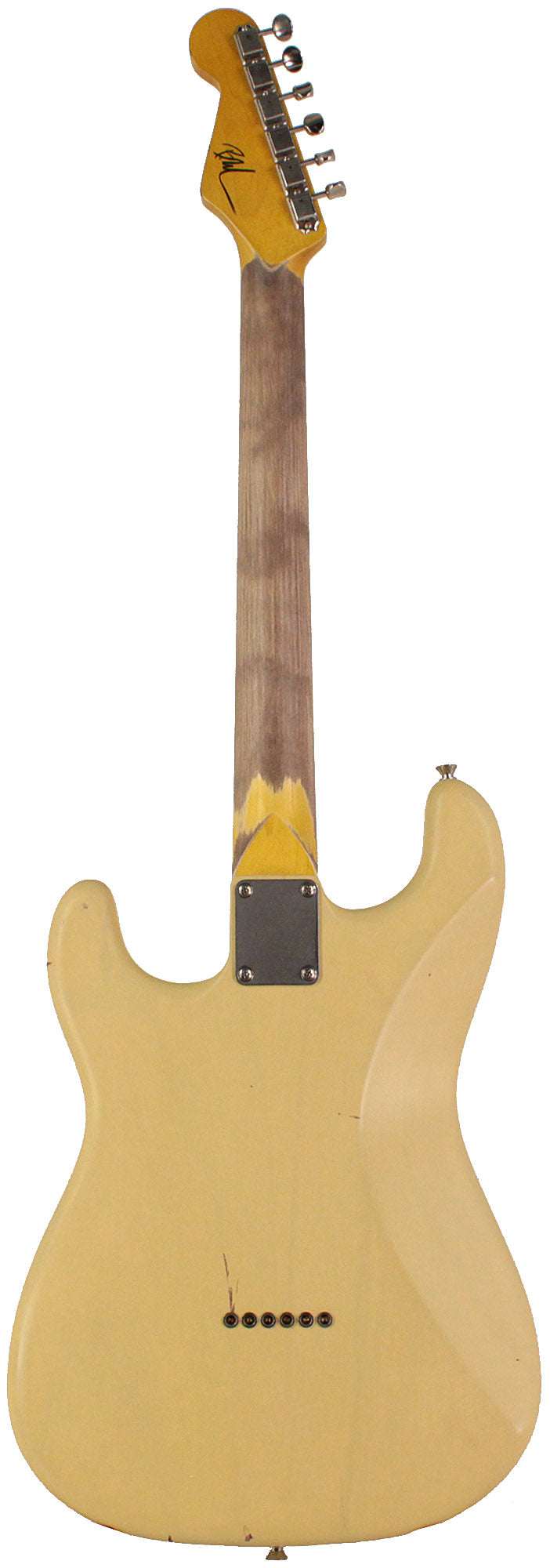 The Lollar Vintage Blonde Strat style pickups are bright but smooth. Scooped midrange, full bass with smooth attack, medium low output sounds glassy, chimey, spanky. Play soft and get round, smooth tone; hit it hard and the attack and treble will come forward in the mix. Works well with overdrives. Alnico 2 flat poles, scattered wound, wax potted coils. Vintage style cloth covered lead wire. Middle is RWRP for humbucking operation in positions 2 and 4.