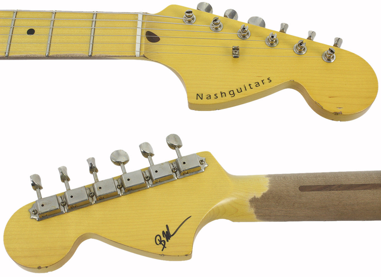 If anyone knows about building vintage guitars, it's Bill Nash! He has worked with a HUGE number of them for many years and has a great deal of knowledge about how a vintage guitar looks and feels. The aged control knobs, pickguards, dinged and scratched finish, and aged hardware make the guitar look old, but the modern techniques used to make the guitar ensure that it plays like a brand new instrument. Each Nash T-72 is built by hand, so each one is completely unique. It features a maple fingerboard, an ash or alder body, and Jason Lollar hand-wound pickups. The bridge is a high quality aged Gotoh 6-Saddle hardtail made from top shelf materials, and the entire guitar is given a level of wear and tear via an aging process.