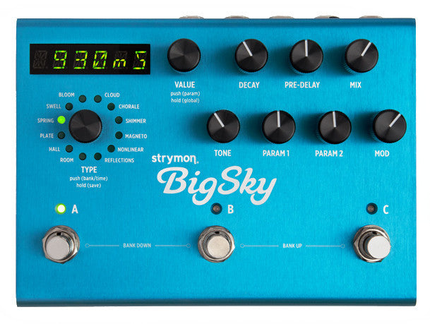 Plug into the Strymon BigSky Reverb and instantly lift your sound into the stratosphere. The world below you fades into the distance, and you're elevated into a glow of lush, glorious, radiant reverbs.