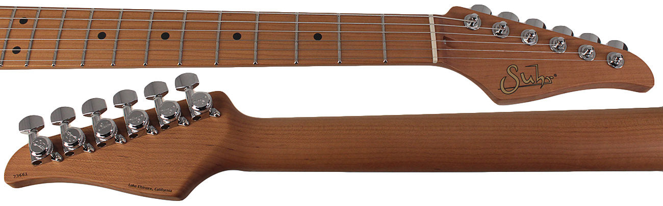 The Standard Pro is equipped with Suhr's much loved Even C Slim profile. Rolled edges and a 10-14" compound fingerboard radius offers a substantial, yet comfortable shape. The Roasted Maple neck is finished in satin acrylic urethane, which provides protection from moisture and smooth playing. Each Standard Pro also includes heavy stainless steel frets and is optimized for superior playability and intonation.