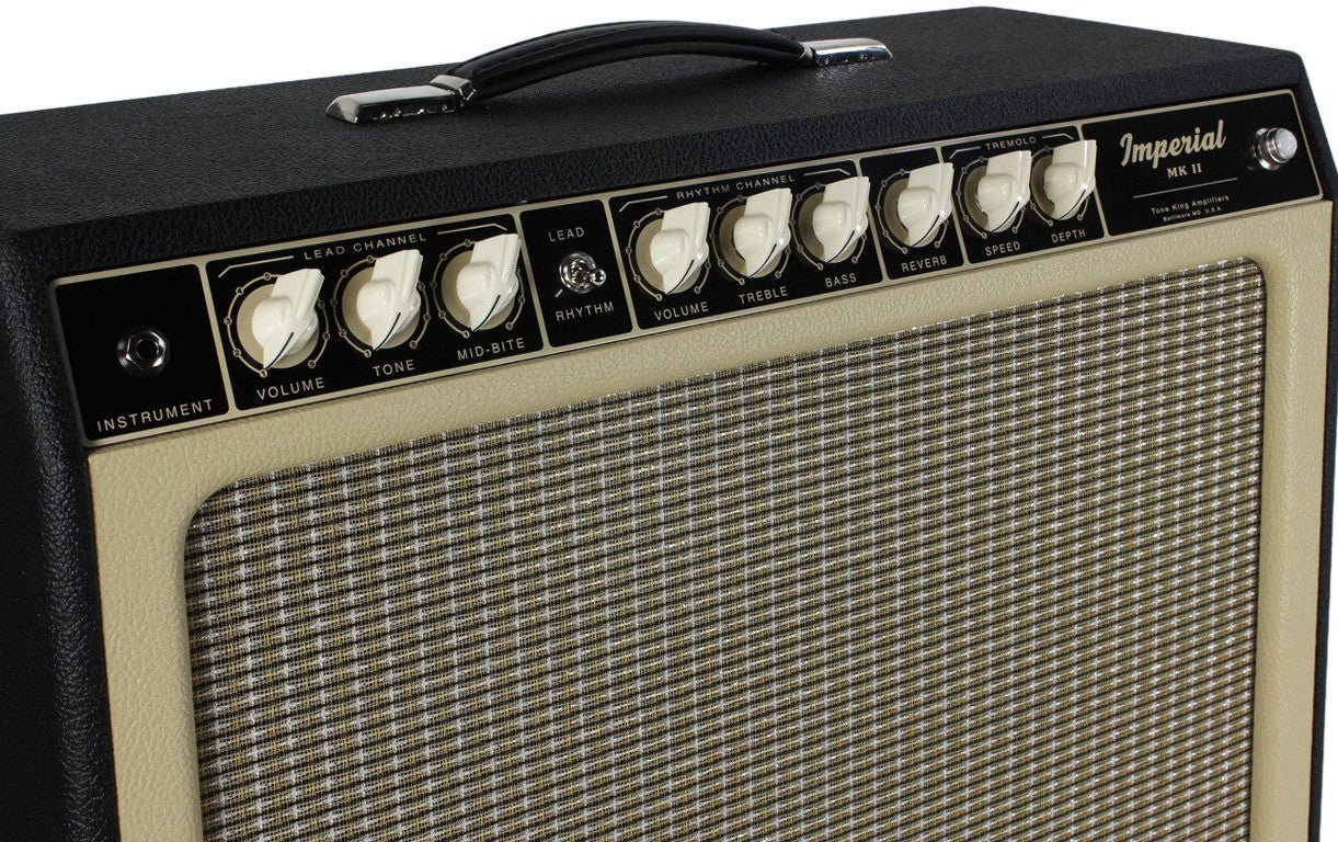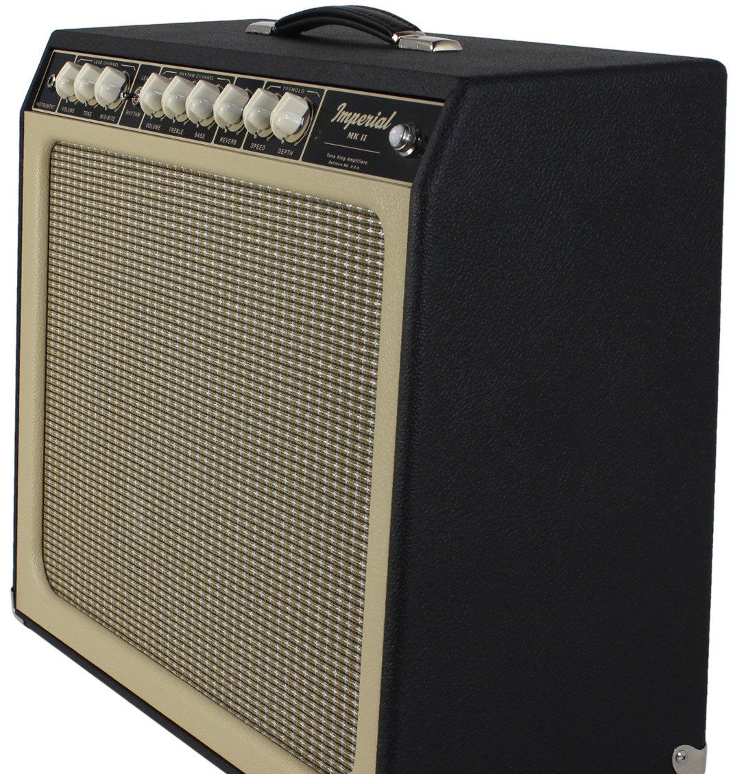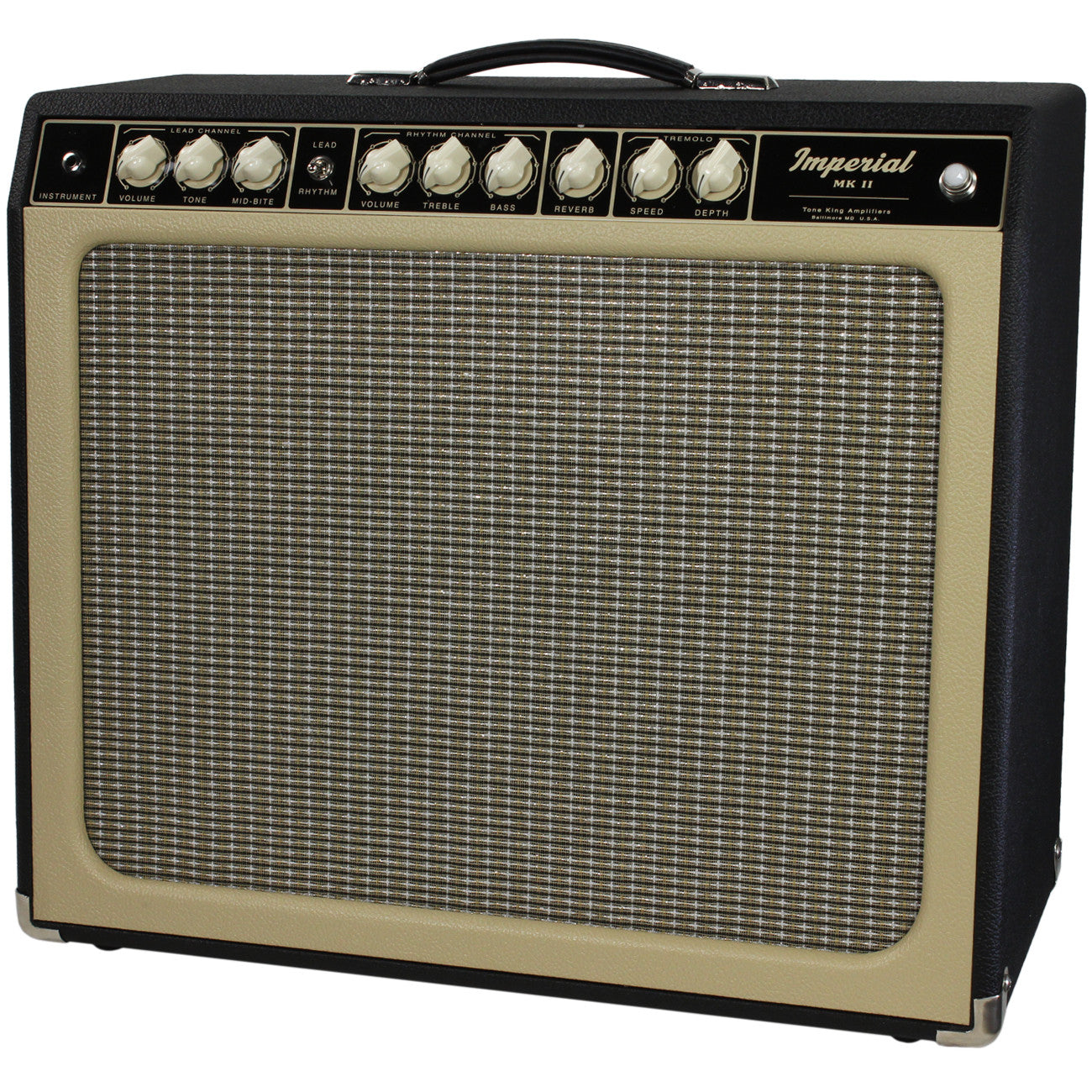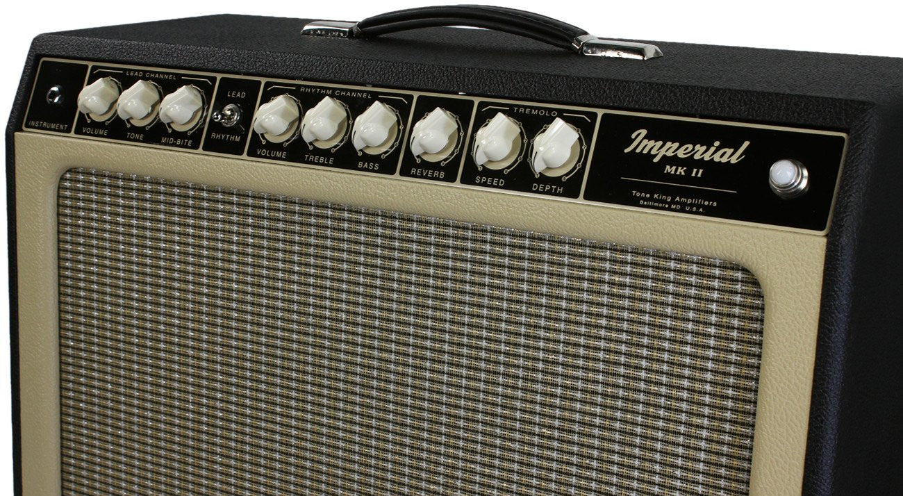 The Tone King Imperial Amp recreates the tone and vibe of a vintage Fender amp and builds upon that even further. This 20 watt, all tube, combo truly captures that classic blackface sound in it's rhythm channel. The tone is easily identified by the Princeton or Deluxe Reverb lovers, but with more of an organic feel, like a classic tweed deluxe. You get the expected shimmery cleans, but you also have the gritty overdrive that this type of amplifier is known for. With that, you get an improved ability to control the timbre and expression of the notes with your fingering and pick attack.
