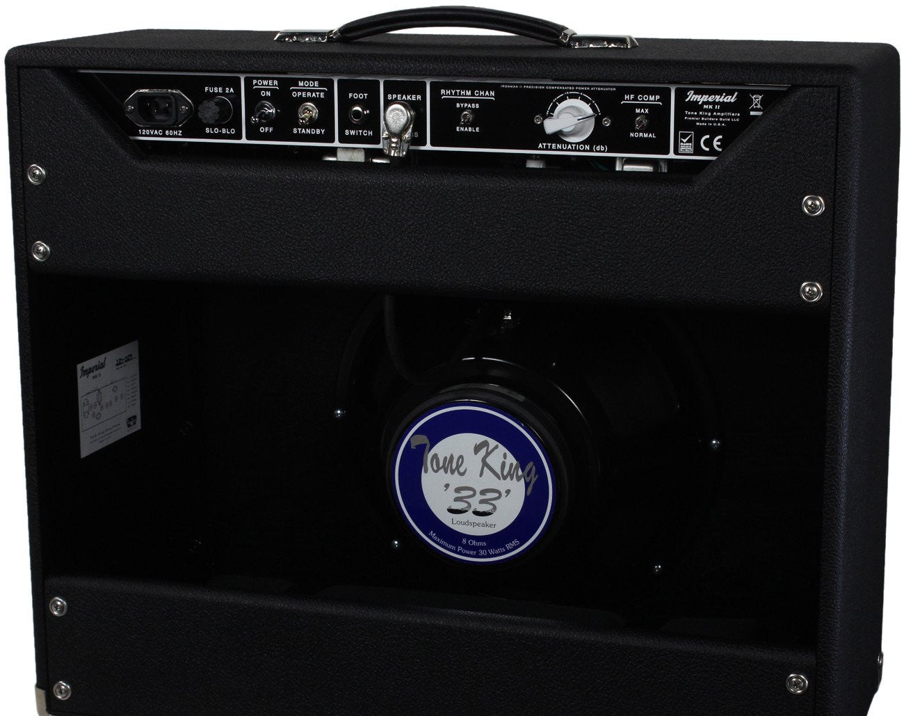 The new Tone King Imperial MKII Combo is the latest update to the Imperial line and compiles all the best features of its predecessors. Over 20 years of engineering have gone into the making of this amazing amp. It features a Handwired Board Construction that utilizes the best component placement and wire routing to optimize the sonic clarity, thick tone and dynamics. This construction gives you a better bass response, complex harmonic mids, and smooth chime high frequencies. It also incorporates an AC line filter to eliminate interference from electronic device, giving you a constant clear tone.