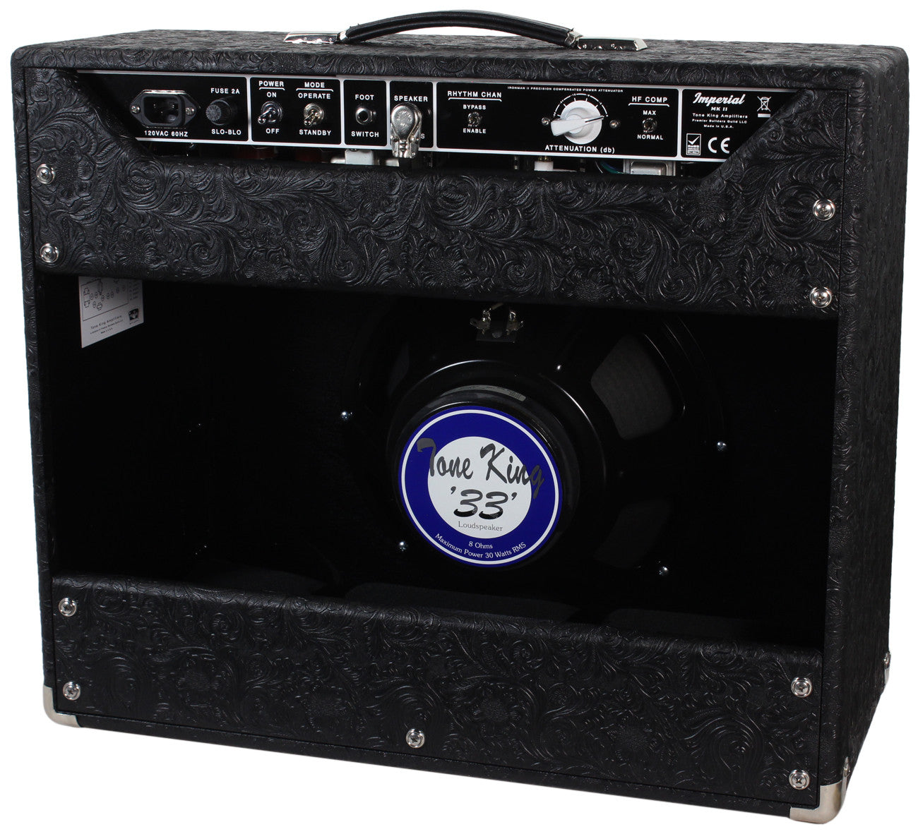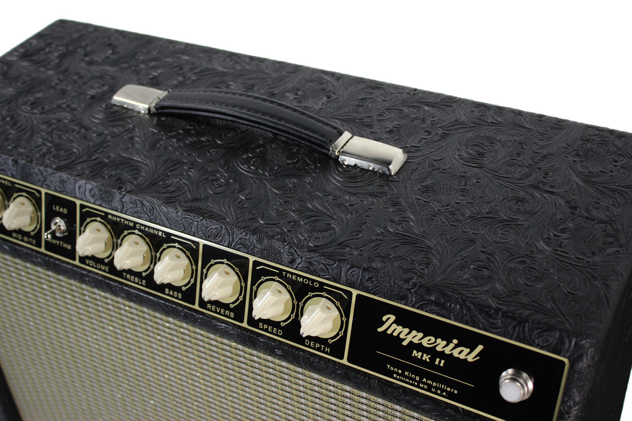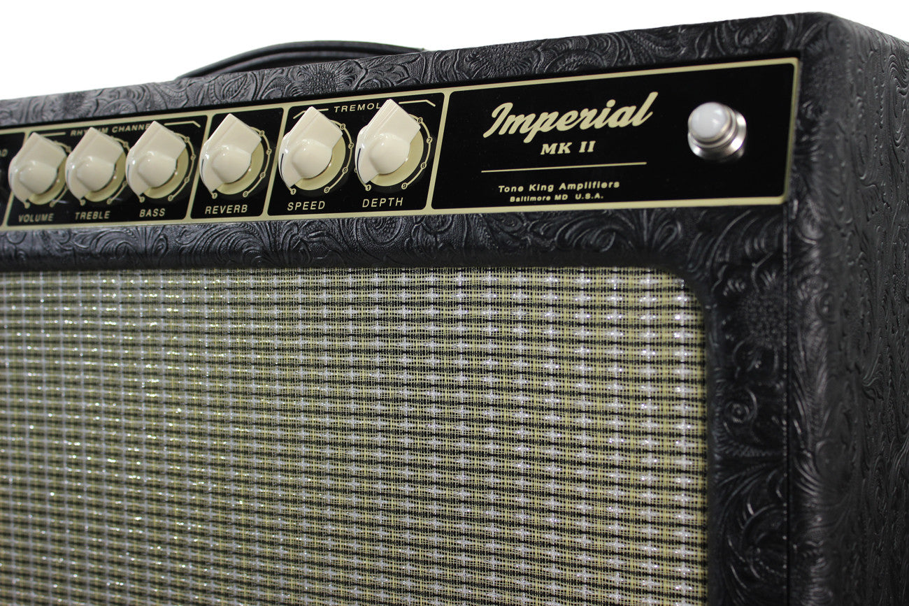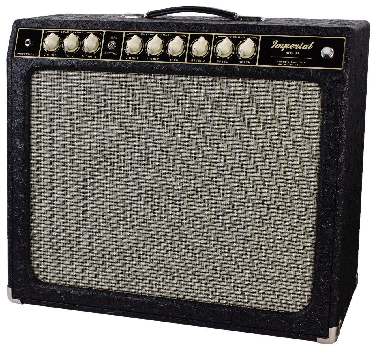 The Tone King Imperial Amp recreates the tone and vibe of a vintage Fender amp and builds upon that even further. This 20 watt, all tube, combo truly captures that classic blackface sound in it's rhythm channel. The tone is easily identified by the Princeton or Deluxe Reverb lovers, but with more of an organic feel, like a classic tweed deluxe. You get the expected shimmery cleans, but you also have the gritty overdrive that this type of amplifier is known for. With that, you get an improved ability to control the timbre and expression of the notes with your fingering and pick attack.