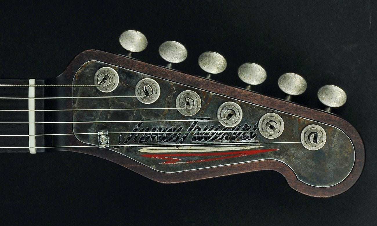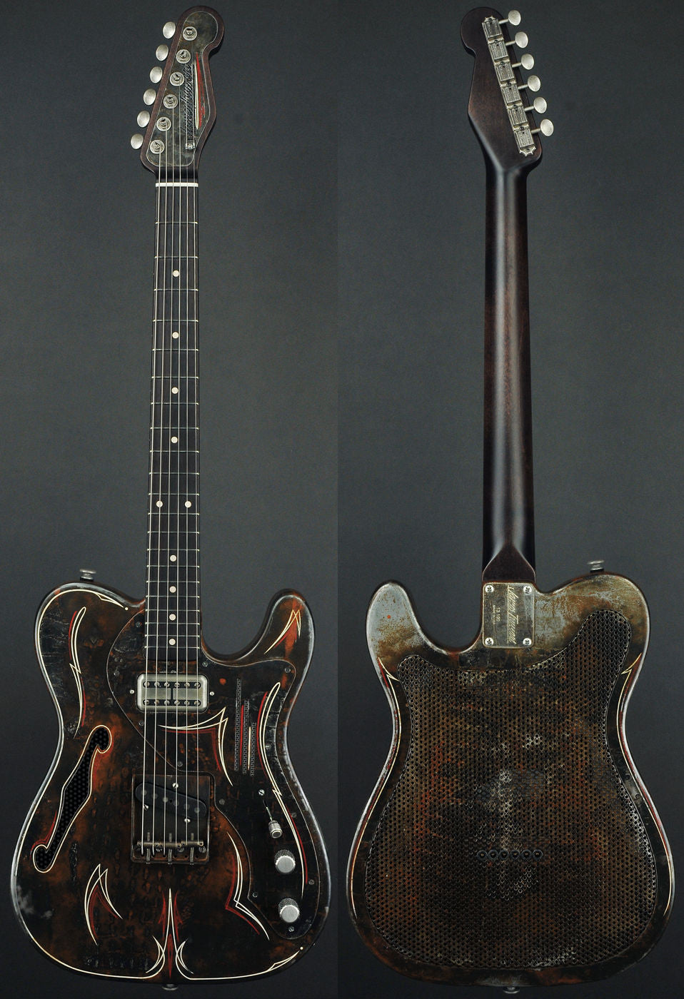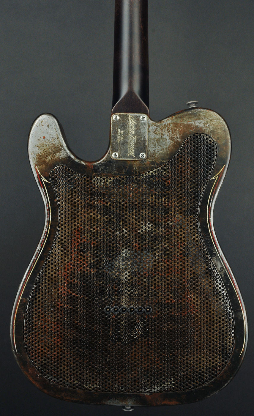 This Deluxe Steelcaster comes upgraded with the Holey Metal Perforated Back which reduces the weight a 1/2 pound, a Classic TV Jones Filtertron pickup in the neck position, upgraded Pinstripe paint job with matching headstock, and finished in the Rust-O-Matic finish.