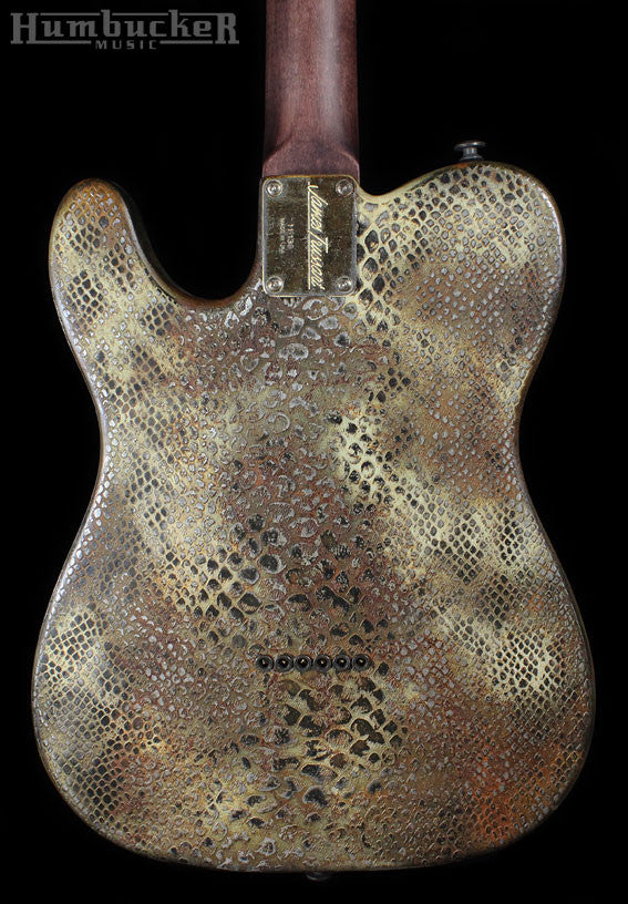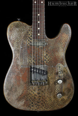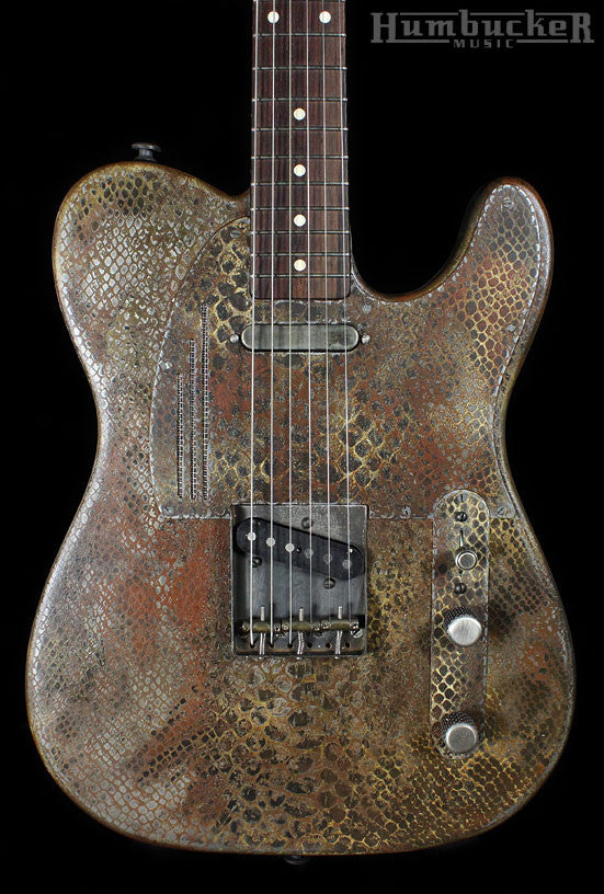 This guitar is the basic Steelcaster design that features brilliant aesthetics in the craftsmanship. The finish on this Steelcaster is Rust Over Cream and features an Engraved Snakeskin front, back, pickguard, and headstock cap.