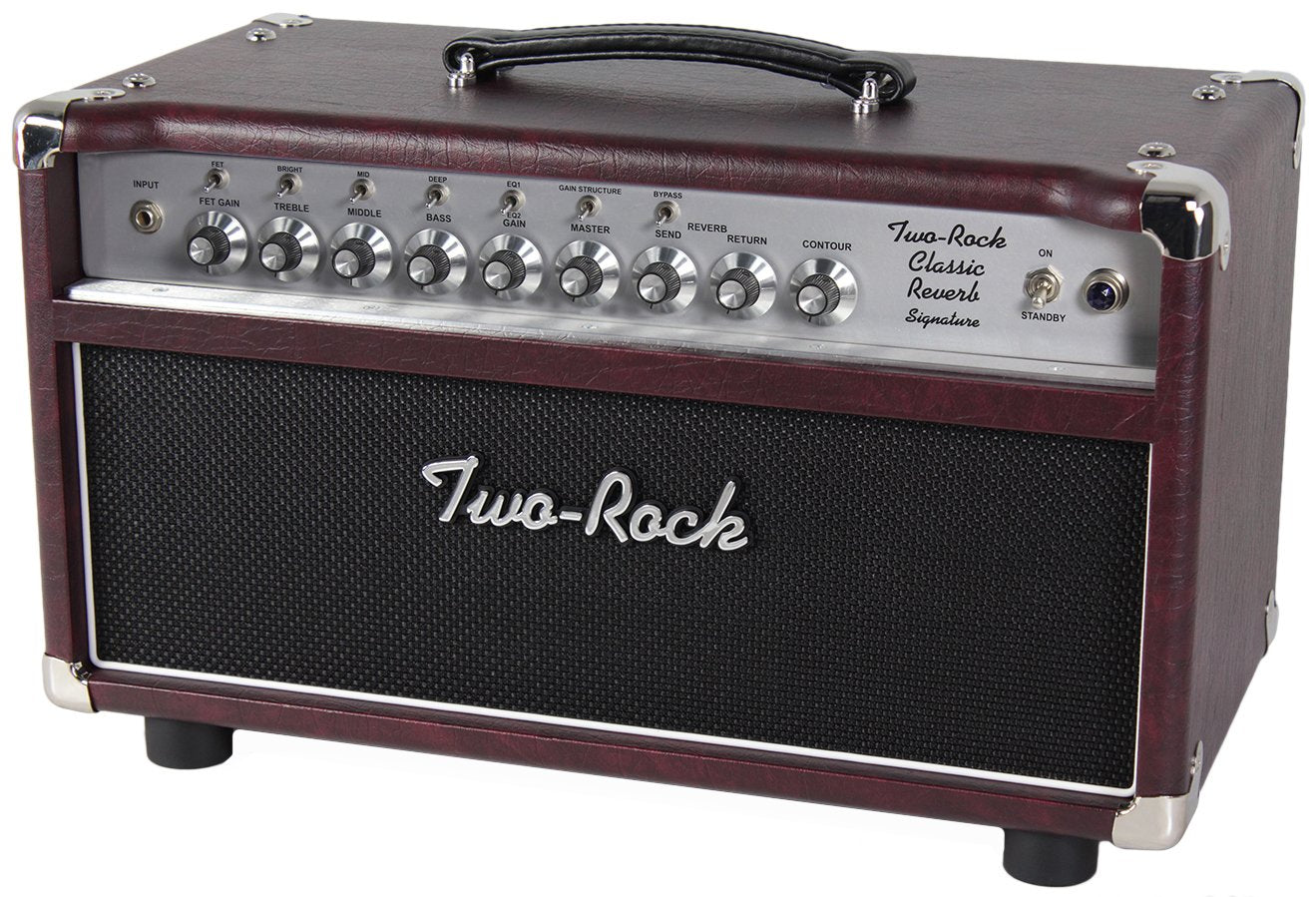 The Two-Rock Classic Reverb Signature is the result of several refinements over the years to one of the most sought after Two-Rock circuits. Using the Sterling Signature and John Mayer Signature amps as their guide, Two-Rock added a few features to enable the guitarist to tailor his clean from super squeaky hi-fi clean all the way to edgy, medium distortion. They're purposely tweaked the input stages to enhance distortion pedal performance. A sophisticated all tube spring reverb is included, featuring 3 voicings, plus individual send and return controls. The presence control has been eliminated and a more useful contour control has been added. At the twelve o'clock position, the amp's frequency response is flat. Rotating the knob counter-clockwise, will decrease the highs and increase the lows, and vice-versa for clockwise movement. This is ideal for switching between single coils and humbuckers without touching other controls or compensating for different speaker cabinets. It's also a great way to compensate for room acoustics without changing your entire preamp EQ.