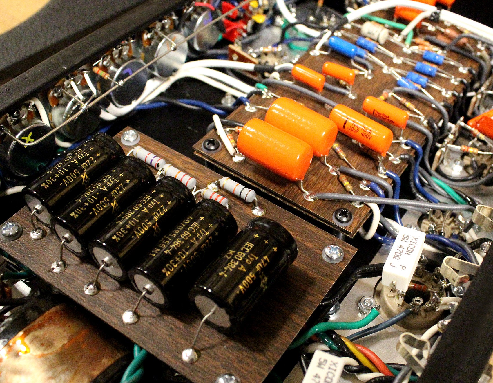 The Studio Signature also features updated build techniques, layouts, and materials implemented over the last few years on the other amps in the Two-Rock line-up. Push-pull pots have been replaced with Two-Rock's custom taper pots, and the boost features now come in the form of front panel toggle switches. The improved reverb circuit now has the Reverb Send control moved to the back panel with the Return now being on the front. The Gain Structure switch can also be found on the back, allowing the same functions as the flagship Classic Reverb Signature essentially giving 3 front-end types to this already versatile clean amplifier. The pickup loading feature found on the previous Studio Pro has been removed.