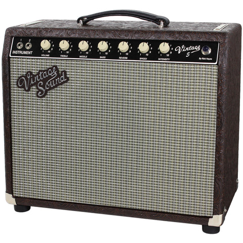 The Vintage Sound Vintage 5 is a new design we've really been looking forward to. It essentially starts out as an all hand-wired, all USA made, super-modified Fender Princeton Reverb. It's based on the "blackface" Fender Princeton Reverb (AA1164) used from 1964-1967, but with several major and significant upgrades (read more below). BUT, the output transformer has been modified to reduce the output wattage down to 5 watts. As well, the preamp has been voiced a bit differently to react with the lower wattage in a more desirable way.